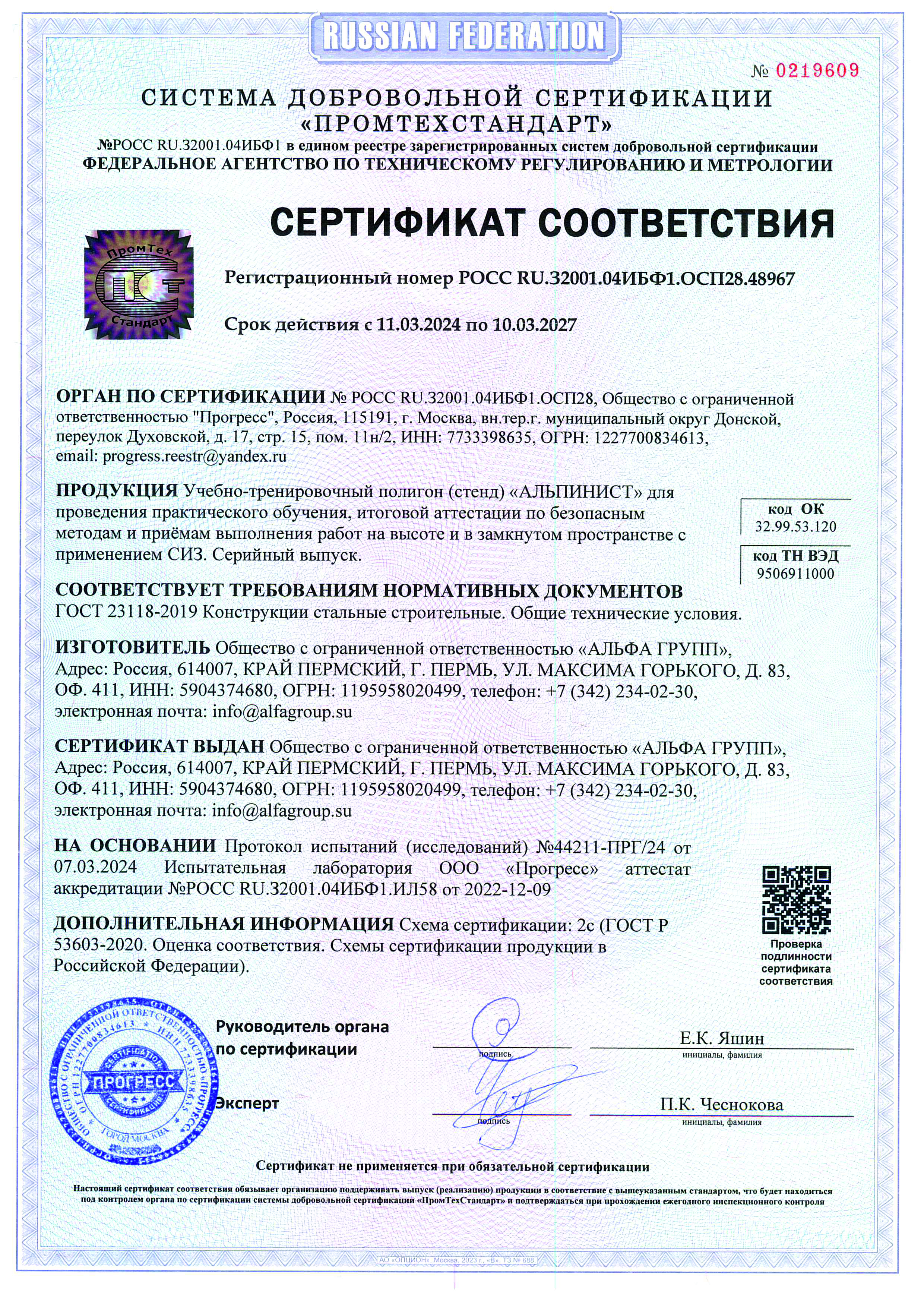 Сертификат ГОСТ на АЛЬПИНИСТ до 10.03.27